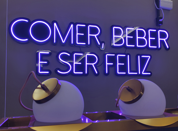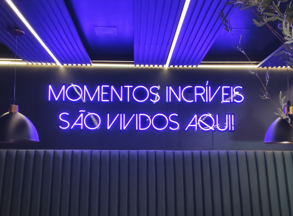 Letreiros produzidos com LED Neon, o que proporciona mais destaque interno e dão vida aos espaços.